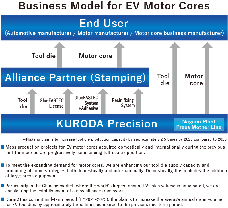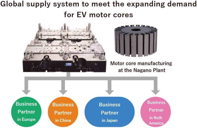 In January 2023, our company, in a joint venture with Marubeni-Itochu Steel Inc. and Benichu Coil Center Kanto, Inc. established "Benichu-Kuroda Laminations Co., Ltd." in Naka City, Ibaraki Prefecture. This new press joint venture company specializes in components for electric vehicle drive motors.We are committed to capturing the rapidly accelerating demand that will pave the way for the future of the EV industry.