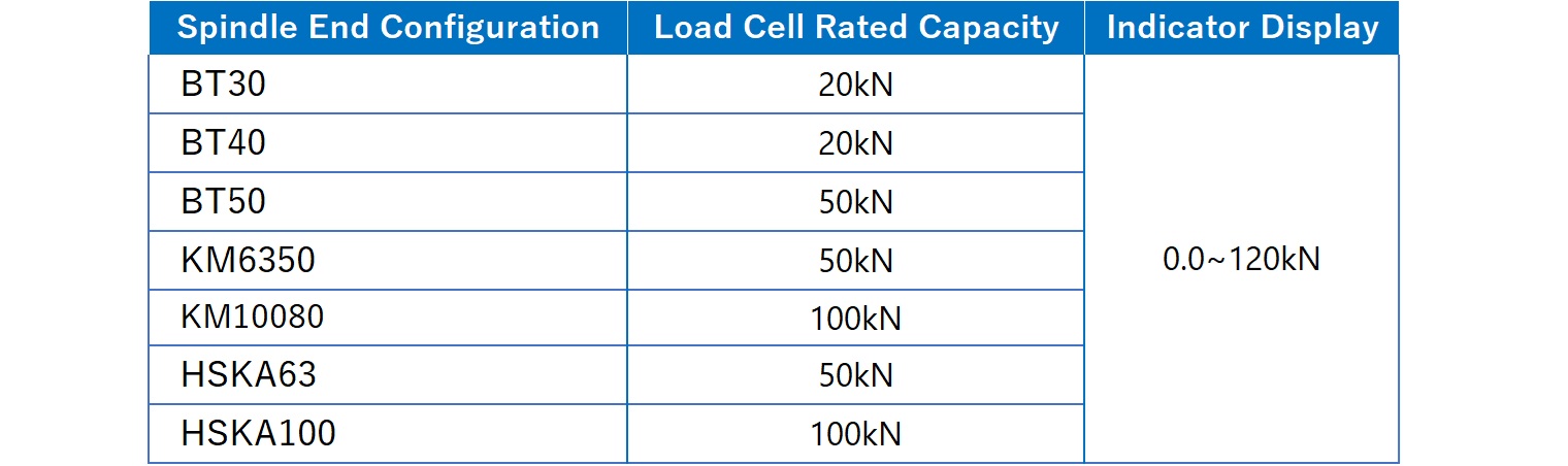 Measures the clamp force of BT, KM, and HSK spindles using a strain gauge-type load transducer (load cell).