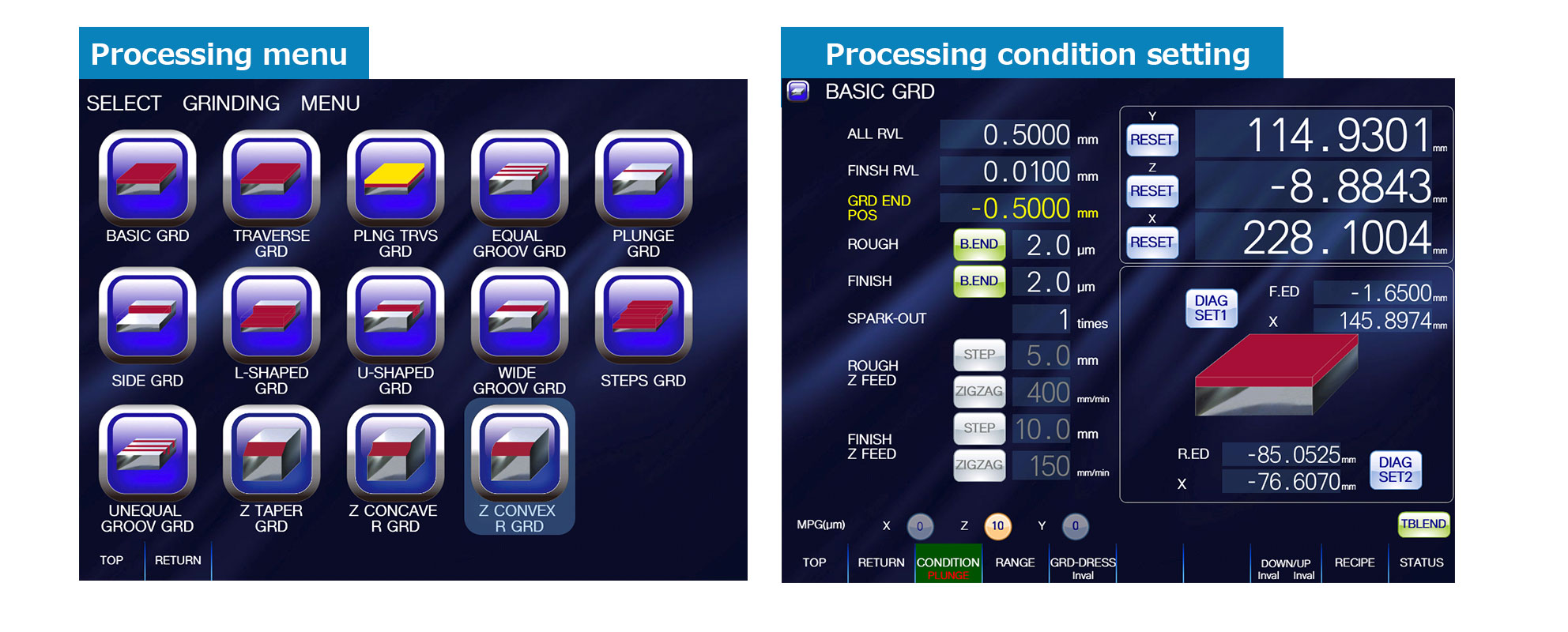 This system provides not only surface grinding but also pitch processing, step processing, L-shaped and concave processing, unequal pitch and depth processing etc..