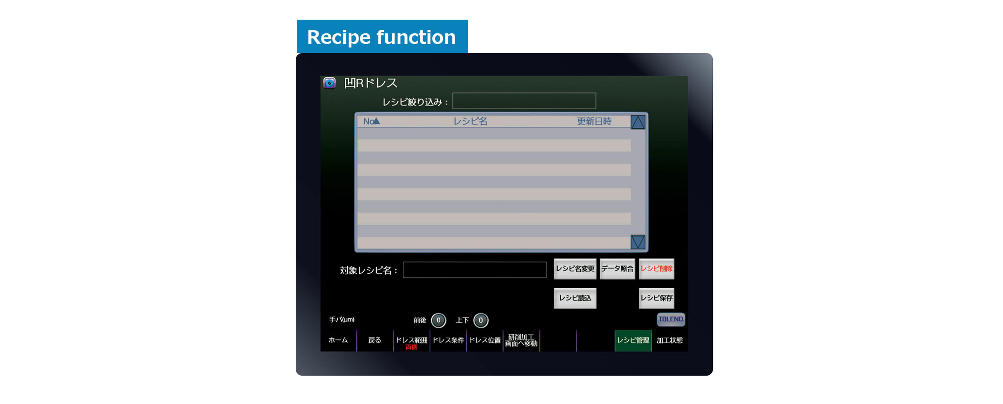You can save your data and conditions regarding processing of work pieces and form dressing of grinding wheels in "Recipe" files.