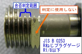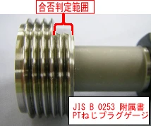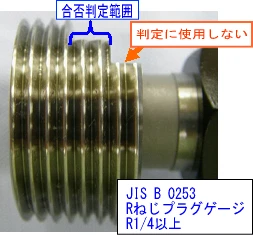 The taper thread plug gauge for R threads has two notches, but the only one used for pass/fail judgment is the one on the small end of the thread. The one on the large end is a step for determining the dimensions and is not used for judgment.