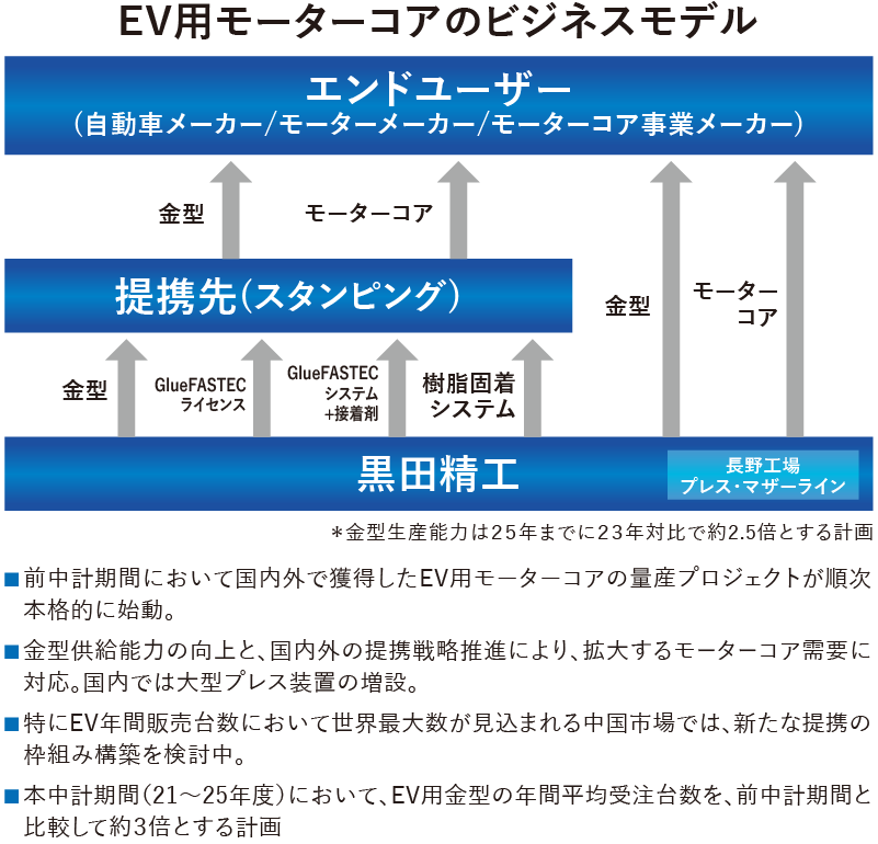 2023年1月、当社は伊藤忠丸紅鉄鋼、紅忠コイルセンター関東との合弁により、茨城県那珂市に電動車駆動用モーター向けのプレス合弁会社「紅忠黒田ラミネーション株式会社」を設立いたしました。電動車産業の未来を切り拓くべく、その躍進を加速させる需要を確実にとらえていきます。