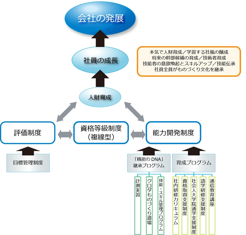 公正で透明性がある人事処遇を基本に、抜擢や若手登用が可能であると共に、精密なものづくりの本源的能力を高める人事制度を構築しています。