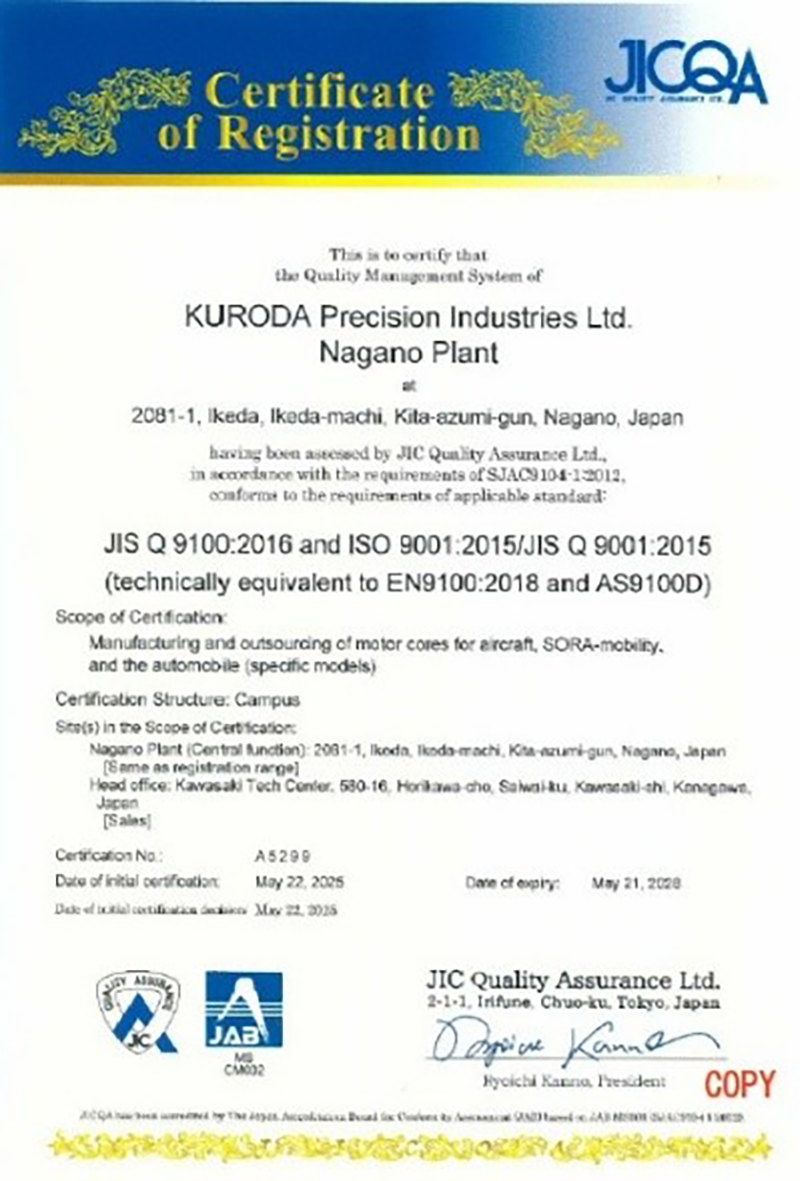 黒田精工株式会社は、このたび航空宇宙分野における品質マネジメントシステムの規格を取得しました。当社金型事業部(長野工場)において取得したのは、「JIS Q 9100:航空宇宙・防衛産業品質マネジメントシステム規格」で、IAQG-OASISデータベース(※)へ登録されました。※IAQG-OASIS:JIS Q 9100(米国AS9100、欧州EN9100)の認証取得組織を一元的に把握・管理するためのグローバルデータベースシステム。IAQG(国際宇宙品質グループ)が運営。