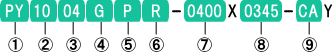 ①シリーズ(PW/PY)②ねじ軸外径(mm)③リード(mm)④ねじ軸材質⑤ナット材質⑥ねじれ方向⑦ねじ軸全長⑧ねじ部長さ⑨精度等級