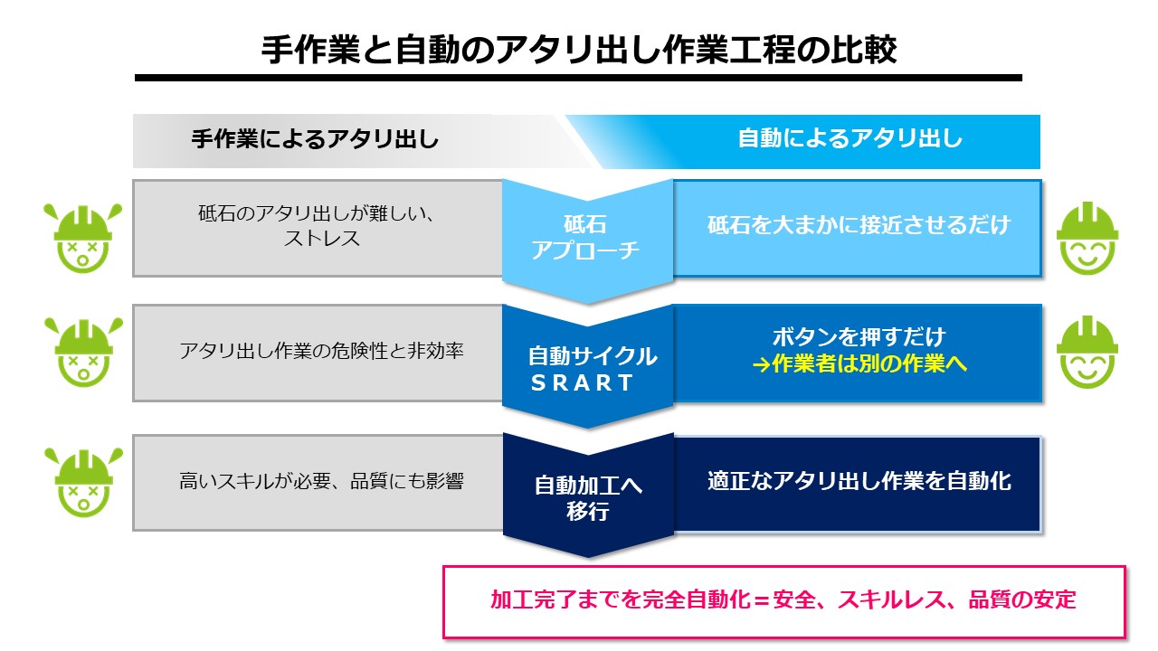 砥石とワークの自動接触検知機能で誰でも簡単、安全にアタリ出し作業を行えます。機械の手離れが良くなるだけでなく、作業の安全性や品質管理性が向上します。