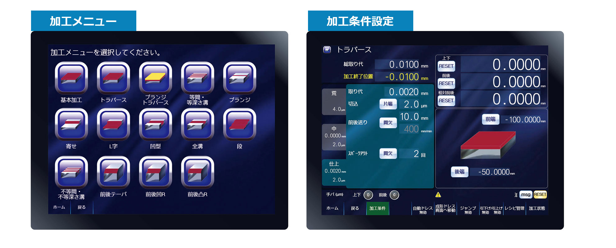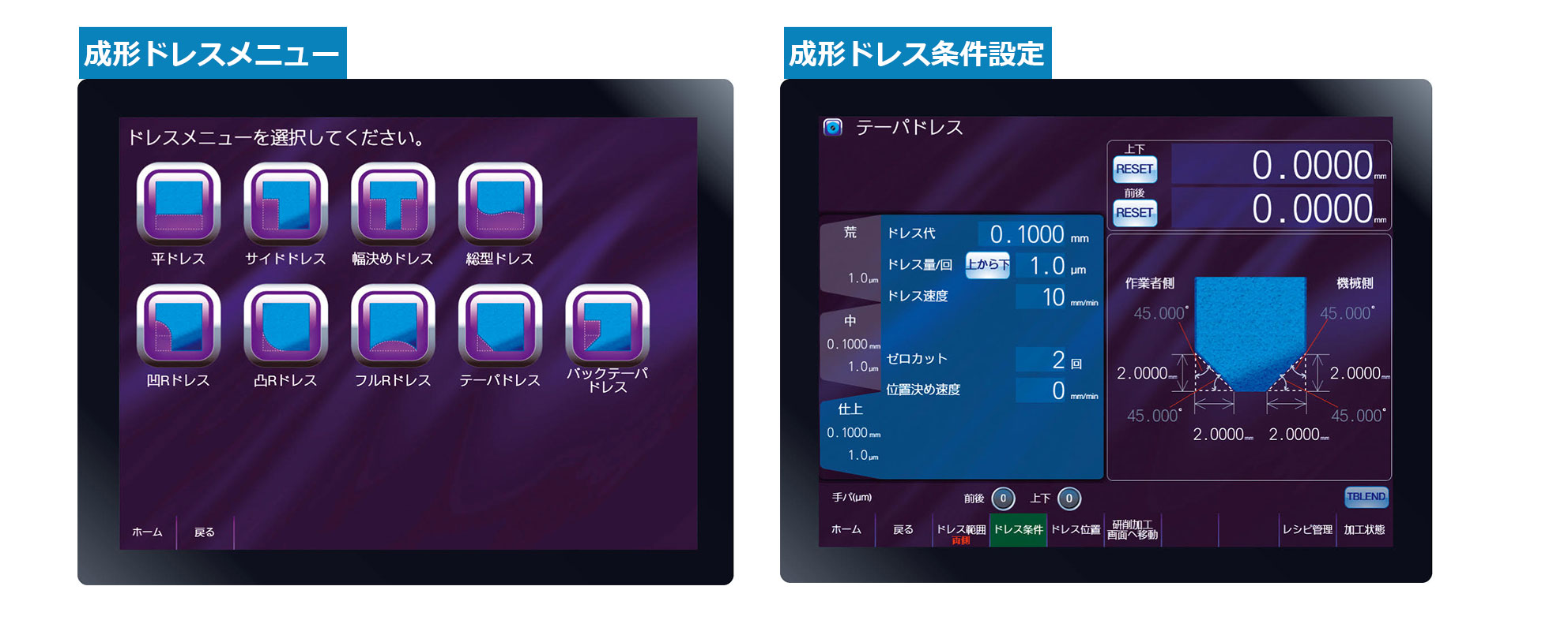 加工や砥石成形ドレスで入力したデータ・条件は「レシピ」に保存可能、保存したレシピは検索機能で簡単に呼び出しが可能。