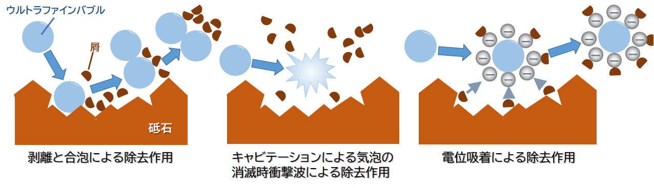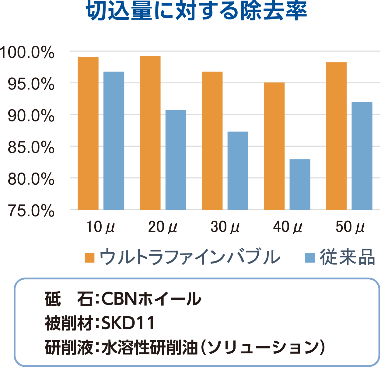 内圧が約20気圧と高圧のウルトラファインバブルが破裂する際、キャビテーションにより砥石の研削屑を除去する効果が考えられ、砥石の研削力(切れ味)を持続させ、切込み量を増大させます。
