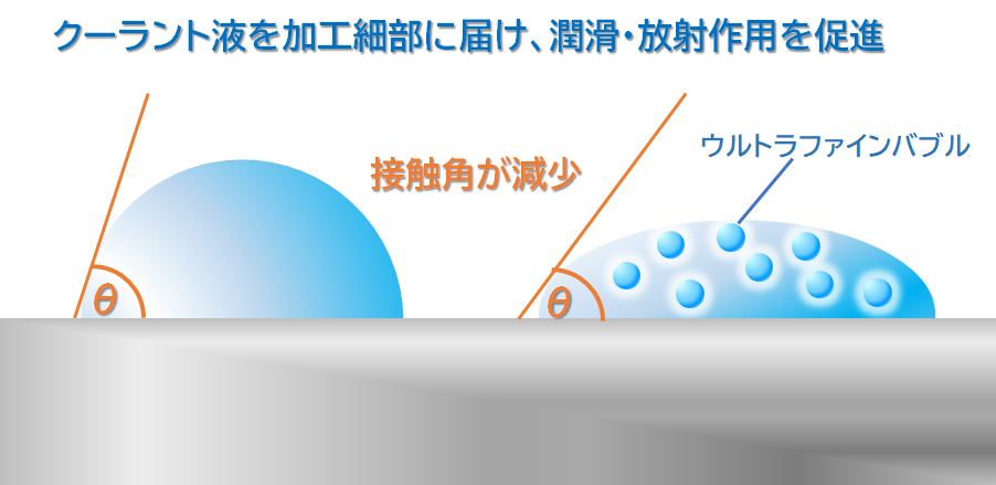 接触角が低いため濡れ性が増し、加工ポイントに届きやすくなり、さらにウルトラファインバブルが破裂する際の気化熱による冷却効果も期待できるため、加工時の熱によるワークへの応力が低減、歪みの低減、寸法精度が向上します。