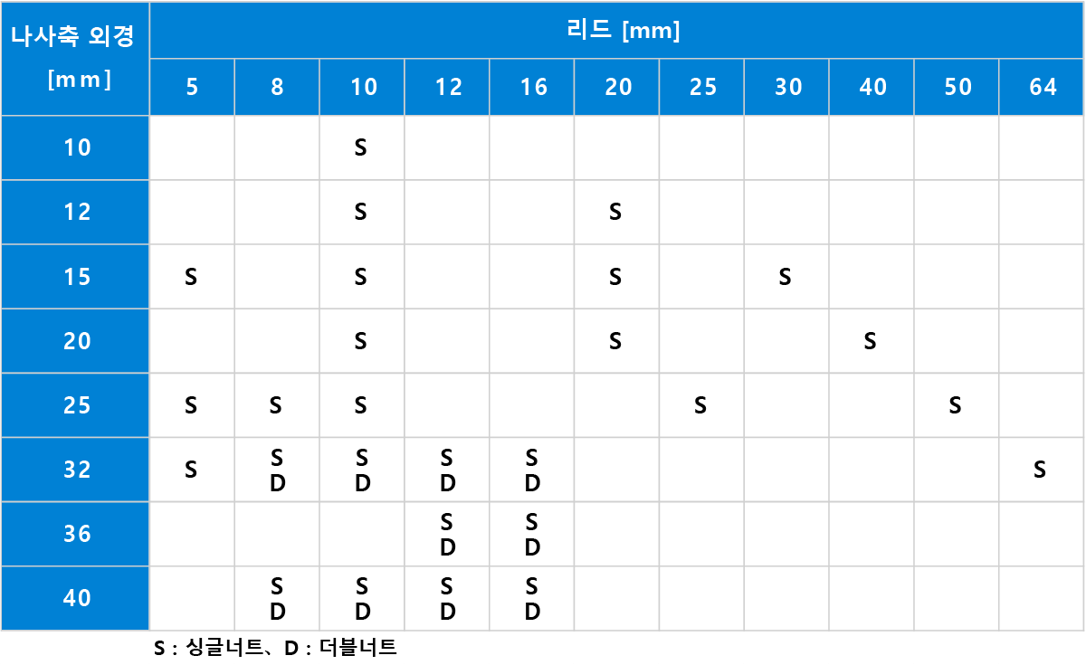 나사 축 외경 φ10~40mm, 정도등급 C1~C7급