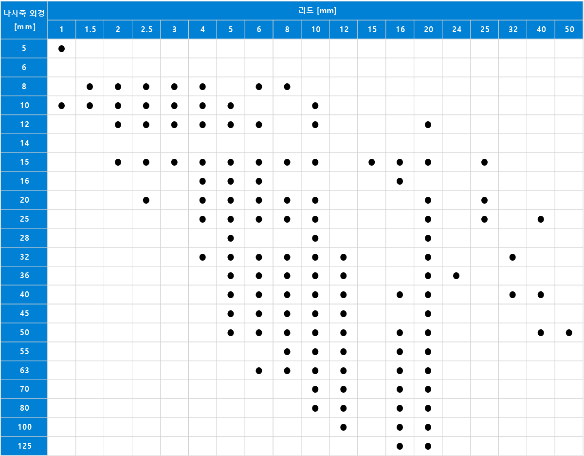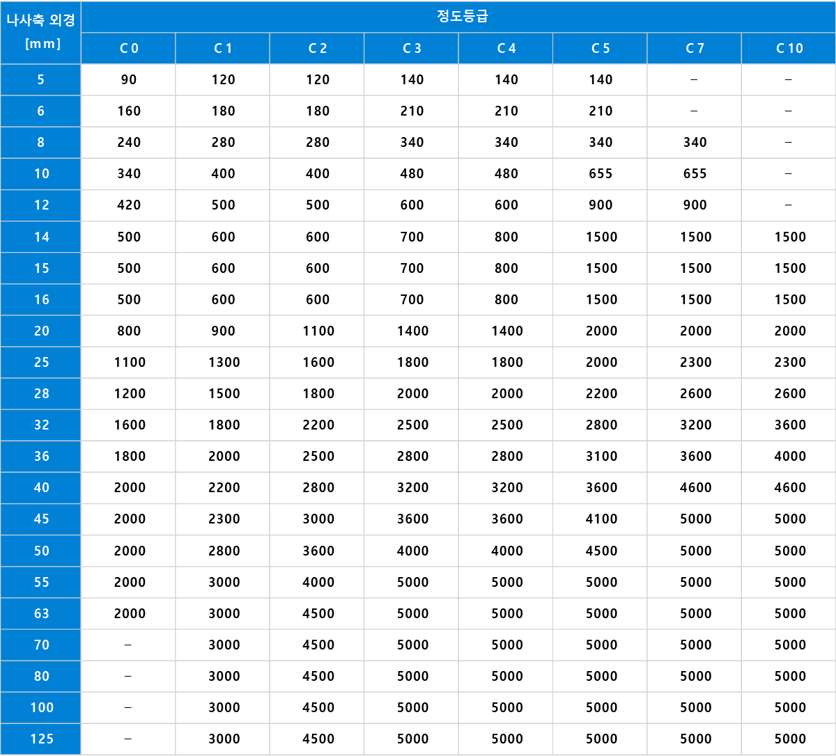 나사 축 외경 φ5~125mm, 정도등급C0~C10급