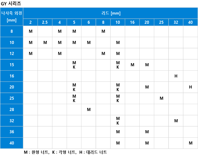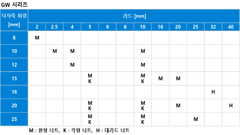 다양한 나사축 외경과 리드 옵션을 통해 최적의 사이즈를 선정할 수 있습니다.