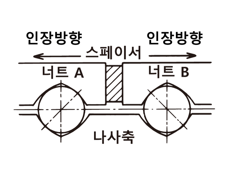 너트 2개를 사용하여 너트 사이에 스페이서를 넣어 소정의 예압을 주는 방식입니다. 중・고예압에 적합합니다.