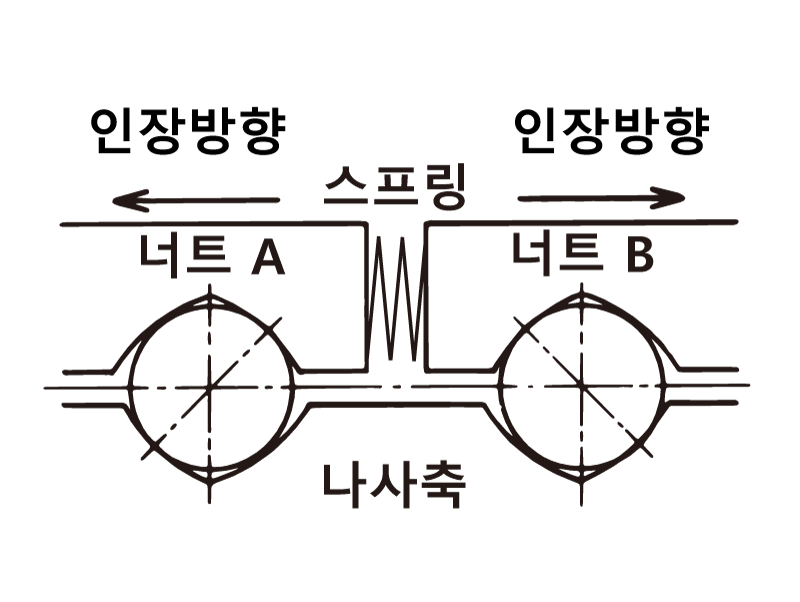 너트 2개를 사용하여 너트 사이에 스프링을 설치하여 소정의 예압을 주는 방식입니다. 토크 변동을 가능한 작게 억제하고 싶은 경우에 적합합니다.