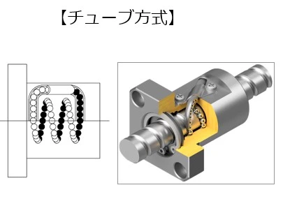 가장 일반적인 순환방식으로 순환부품을 U자 모양으로 구부린 튜브를 사용합니다. 이 방식에서는 튜브에 의해 이끌린 강구가 나사홈 외주를 1.5, 2.5, 3.5회(제품 사양에 따라) 전동한 후 다시 튜브에 이끌려 하나의 서킷을 구성합니다. 정격 하중을 늘리기 위해 하나의 너트에 대해 여러 개의 열(서킷)을 삽입할 수 있으며, 커스터마이즈성이 높고 작은 리드부터 큰 리드의 볼스크류까지 폭넓게 대응가능합니다.