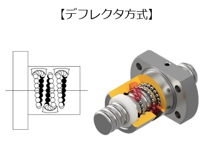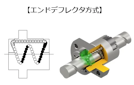 너트의 양 끝에 장착하는 엔드디플렉터에 강구를 다시 끌어올리는 기능을 갖춘 순환방식입니다. 너트본체에 강구가 오가기 위한 관통구멍이 설치되어 있습니다. 지금까지의 설명은 앤드캡과 동일하지만 차별점으로는 고주속성이나 정숙성을 들 수 있습니다. 부드러운 강구의 흐름을 추구하여 설계되었기 때문에 무리가 없는 움직임으로 강구가 순환, 컴팩트성을 가지면서 성능 향상을 실현했습니다.
