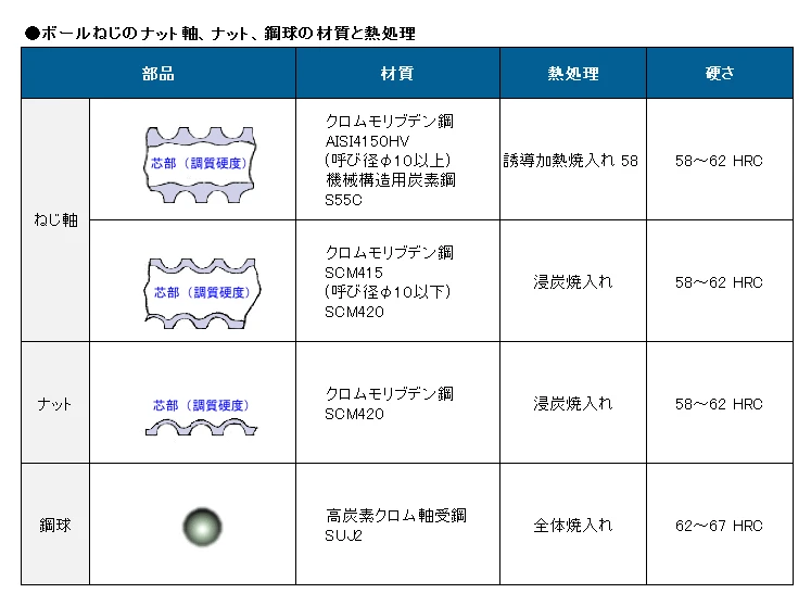 나사축이나 너트의 나사홈면의 경도는 볼스크류의 특성상 수명에 큰 영향을 미칩니다.