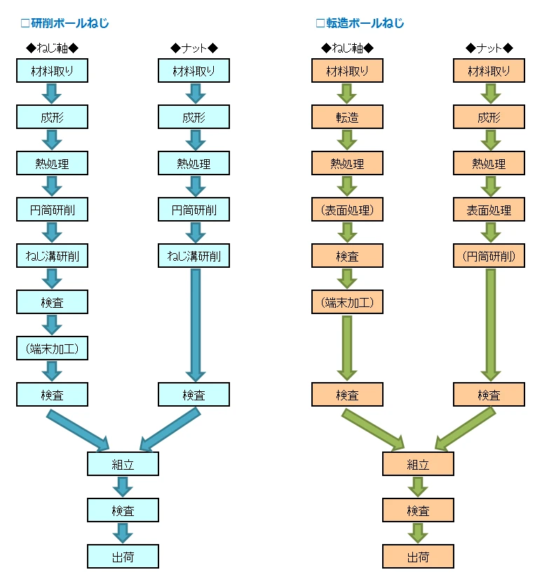 2가지 종류의 볼스크류에 대해 주요부품의 나사축과 너트의 일반적인 제조공정흐름을 참고로 소개합니다.